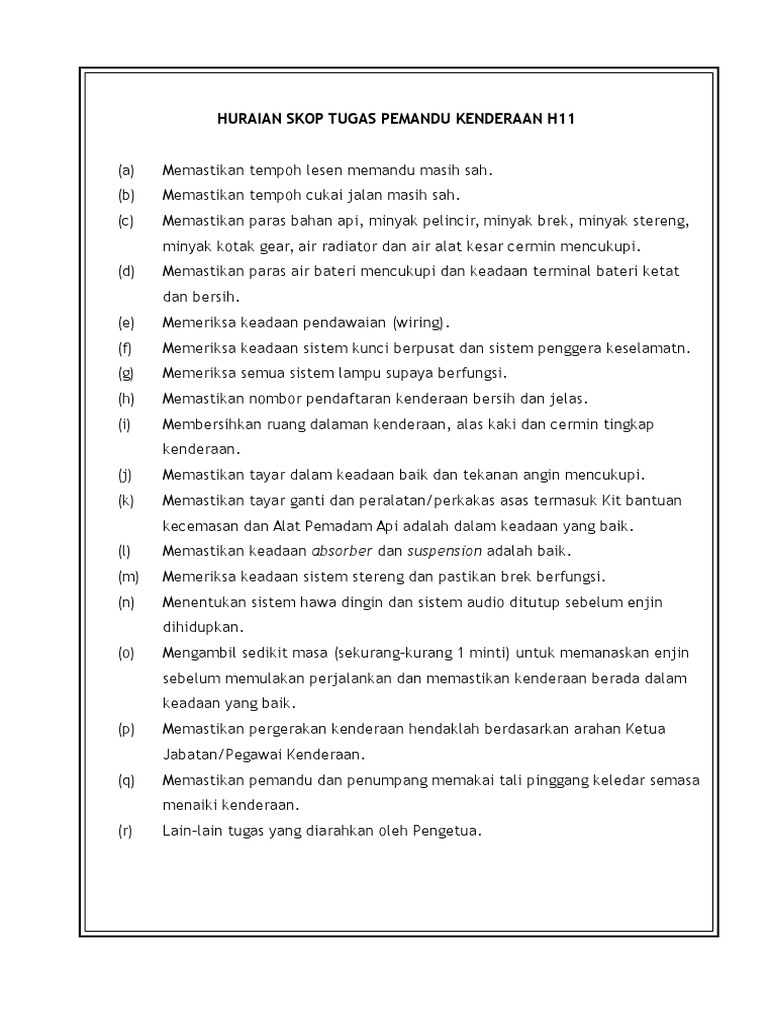 Skop Tugas Pemandu Kenderaan H11. Untuk memohon pastikan anda rujuk syarat pengambilan bidang tugas jawatan dan lokasi kekosongan jawatan terlebih dahulu. A Secara amnya skop dan fungsi Pemandu Kenderaan adalah merangkumi tanggungjawab sebelum memandu pada setiap hari.