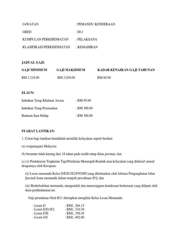 Pemandu Kenderaan Gred H11 Jawatan Kosong Pemandu Kenderaan Gred H11 Gaji Rm1 218